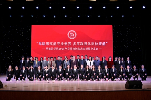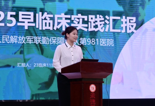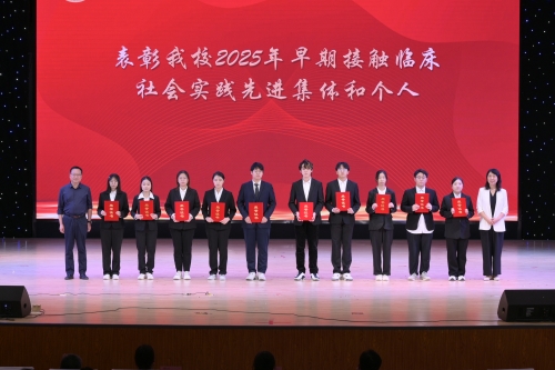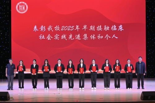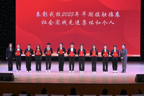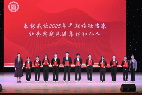 “优秀团队”代表发言 王瑞婷宣读了表彰决定,勉励同学们永葆对医学事业的敬畏与热忱,将实践中的疑问转化为钻研的动力,在临床观察中感悟专业精神,在服务患者中涵养职业担当。随后,与会领导为荣获“优秀日志”(90份)、“先进个人”(320名)和“优秀团队”(45支)代表颁发荣誉证书,激励更多同学积极参与早临床实践。